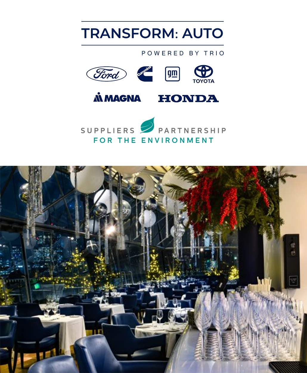 The dinner will be hosted at the OXO Tower Restaurant with its iconic views of St. Paul’s and the river Thames. This special evening brings together key Transform: Auto stakeholders to celebrate global collaboration, innovation, and supplier decarbonisation.