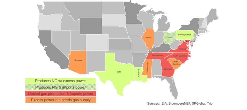 From this shortlist of states, I overlaid each with the most recent data from the EIA to show whether they can meet their existing power loads. States that do not currently produce enough power within their borders to meet existing demand will either need to build more in-state generation or import more power. Then I added a metric to each state that has announced plans to add natural gas-fired generation capacity of at least 1,000 MW. Finally, I layered on the likelihood of each of those states producing more natural gas within its borders, indicating the potential of increasing natural gas production without reliance on outside imports of either natural gas or power from bordering states.